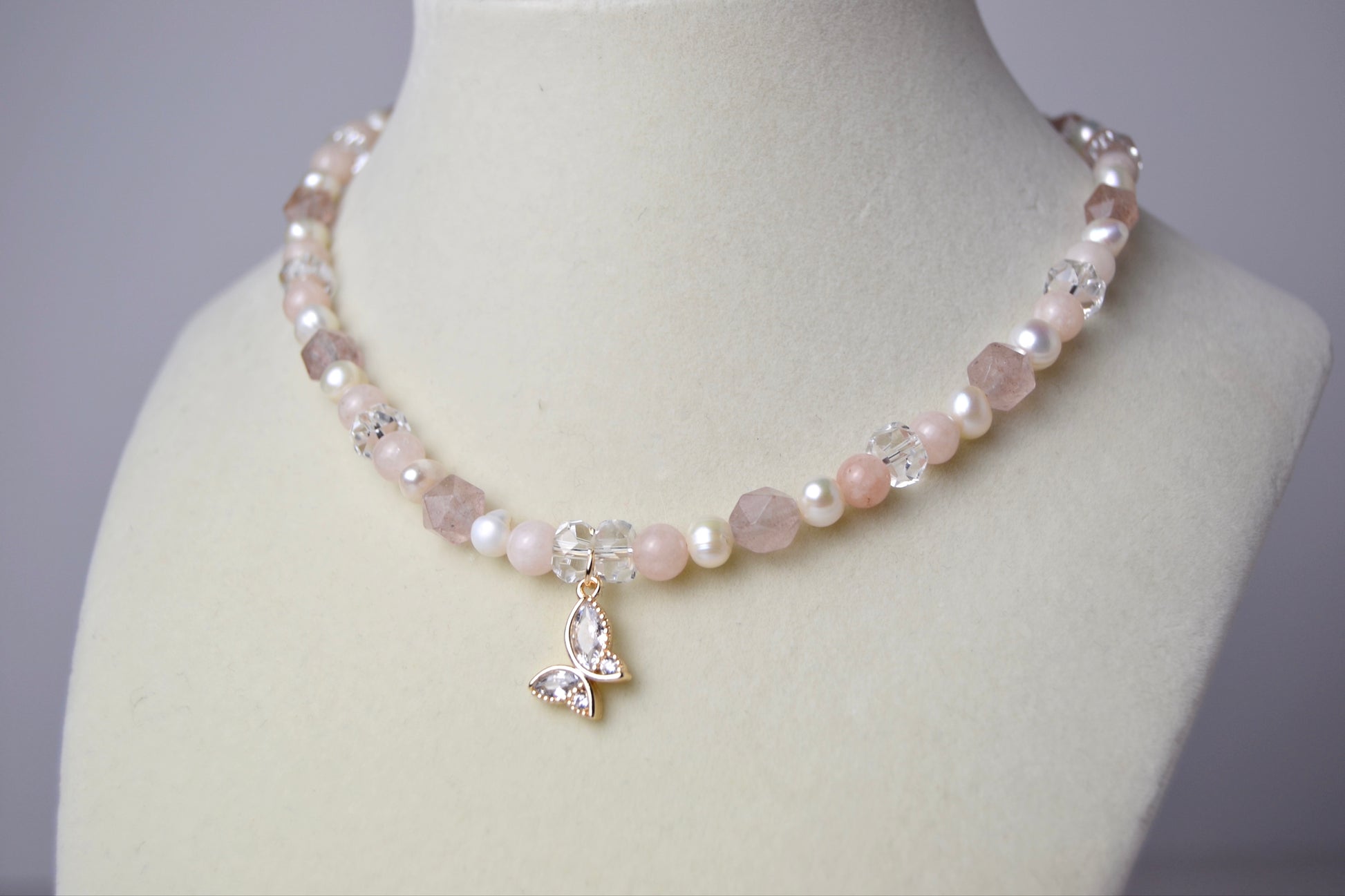Compassionate Love is one of the most profound love there is. This loving combination of rose quartz, strawberry quartz, clear quart, and fresh water pearls connects us with the energies of pure love and compassion. This piece was made with the intention to teach us to be gentle and compassionate towards ourselves and others in the midst of healing.